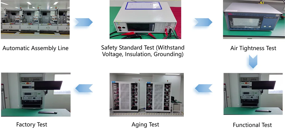 Tuote on läpäissyt EU:n CE-sertifioinnin, Yhdysvaltain FCC-sertifioinnin, Kiinan CCC-sertifioinnin ja CB-sertifioinnin, joka täyttää IEC 62368-1 -turvallisuusstandardit ja RoHS-ympäristövaatimukset sekä täyden prosessin laadunvalvonnan raaka-aineista valmiisiin tuotteisiin. Tehtaalla on standardoidut tuotantolinjat ja ammattimaiset testauslaboratoriot. Jokaiselle tuotteelle suoritetaan 72 tunnin jatkuva ikääntymistesti, jännitekestävyystesti, korkean ja matalan lämpötilan ympäristötesti ennen tehtaalta lähtöä vakaan suorituskyvyn varmistamiseksi. Tarjoa tuotteiden pätevyystodistukset ja testiraportit, jotka tukevat asiakkaiden paikan päällä tehdastarkastusta ja laadunvalvontanäytteenottoa.