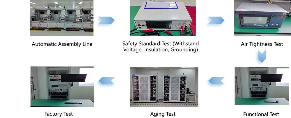 Tuote on saanut viralliset sertifikaatit kotimaassa ja ulkomailla, mukaan lukien CCC (China Compulsory Certification), CE (Euroopan unioni), UL (Yhdysvallat) ja EN50498. Se on standardien NB/T33001-2025 ja GB31241-2014 mukainen, mikä varmistaa sähköturvallisuuden ja sähkömagneettisen yhteensopivuuden. Meillä on nykyaikainen tuotantopohja ja käytössämme on palosuojattu ABS+PC-komposiittimateriaalikotelo, jossa on V0-luokitus ja FR-4-lasikuitupiirilevyt. Keskeiset juotosliitokset on käsitelty aaltojuotosteknologialla, ja ne ovat läpäisseet tiukat testit, kuten 5 000 sisäänvienti-/poistosykliä, tärinänkestävyyttä ja suolasuihkukorroosionkestävyyttä. Jokaiselle yksikölle suoritetaan 72 tunnin täyskuormituksen ikääntymistesti ennen tehtaalta lähtöä, jolloin saavutetaan 100 % pätevyysaste. Olemme perustaneet kattavan laadunvalvontajärjestelmän, joka mahdollistaa täyden jäljitettävyyden raaka-aineiden hankinnasta valmiiden tuotteiden toimitukseen.