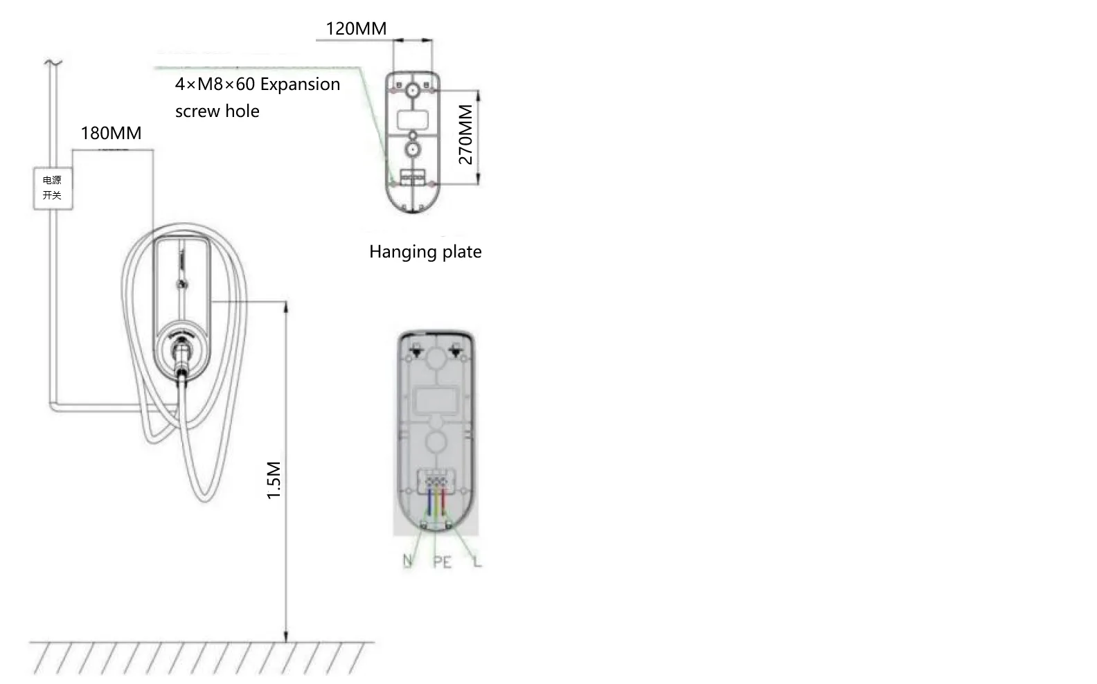 1) Latauspaalun korkeuden vertailutiedot maasta (1,3-1,5 metriä)2) Merkitse kiinnitysreiän sijainti seinään taustalevyyn taustalevyn asennusreiän sijainnin mukaan.